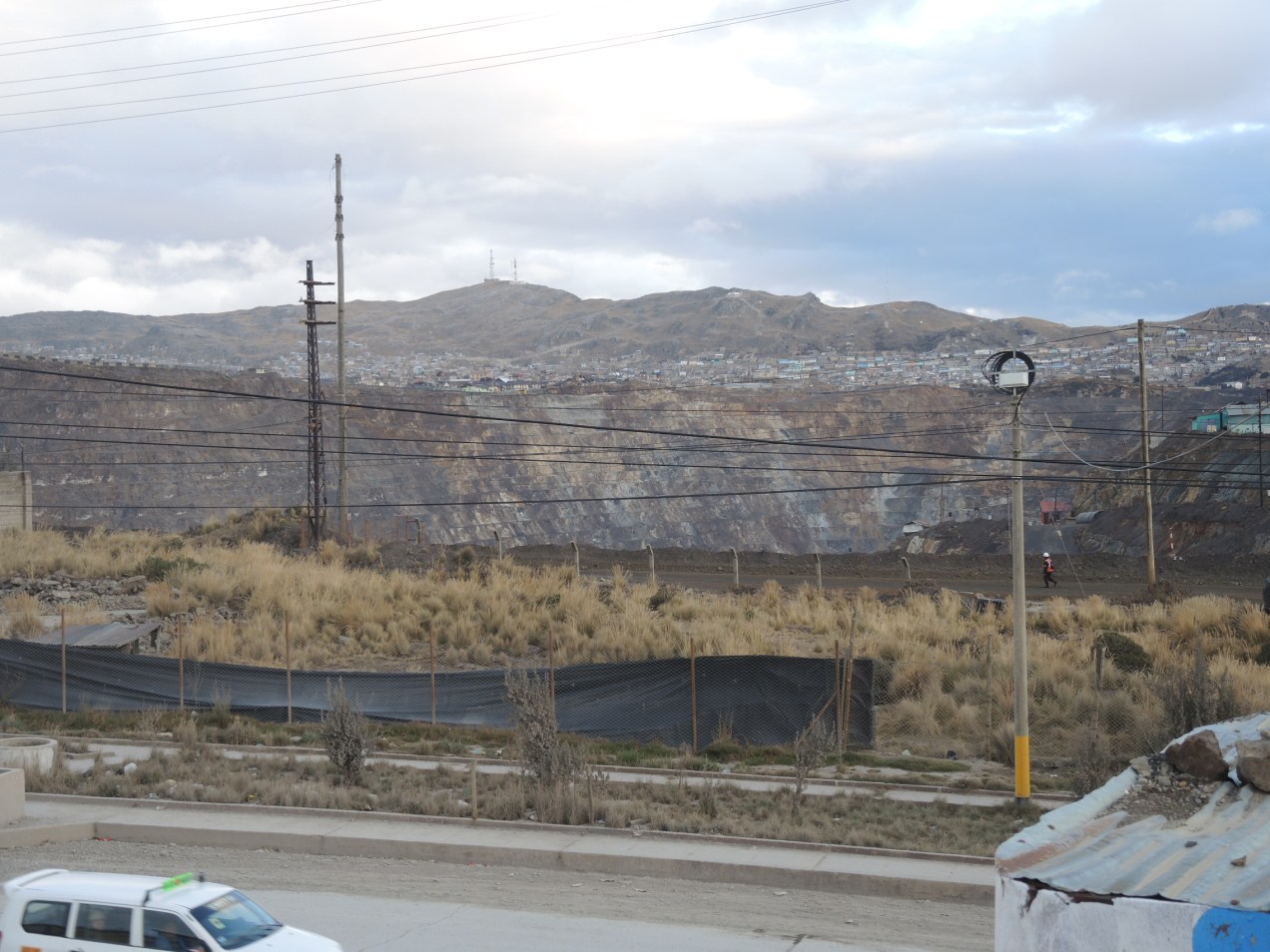 Für die Biker hart ist die größte Steigung auf den letzten 5km. Und was erwartet uns am Pass auf 4.300m? Ein riesiges Loch! Und eine Stadt. Und Schutt. Cerro de Pasco ist eine Bergbaustadt rund um eine große Mine (das Loch) und riesige Abraumhalden. Im Umfeld befinden sich weitere Minen – Zink, Silber.