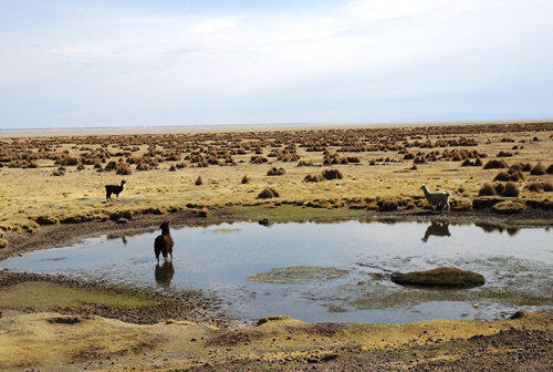 Nun sind wir wirklich da. Der Name sagt alles: Alti (hoch, ja – 3.600 bis 4.000m) und Plano (wirklich eben). Bewuchs: etwa Gras, ausreichend fuer die Lamas und die verwandten Wildtiere, die Vikunas. Dazwischen seichte Seen. Wir fahren entlang des Lago Popoo. Der ist mehr als 100km lang. Uebrigens stammt von hier, der unwirtlichen, einsamen Gegend der Praesident Boliviens, Evo Morales.