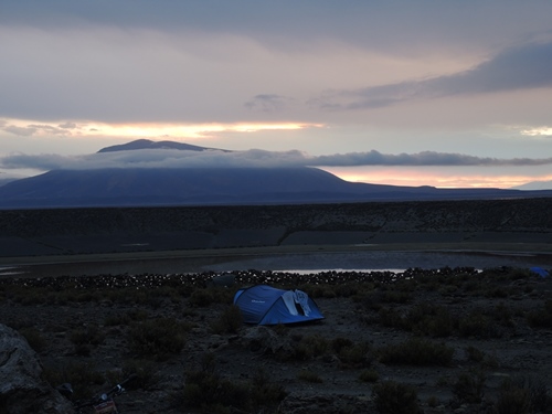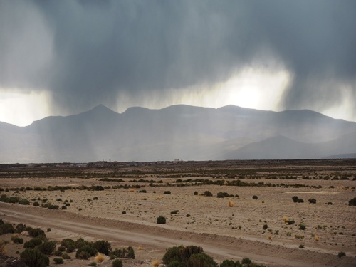 Wetter: Seit LaPaz jeden Tag am spaeten Nachmittag Gewitter, Sturm, Regen, Kaelte. Ich habe noch nie Regenvorhaenge dieser Dimension, die sich um den halben Horizont ziehen – samt den dazugehoerigen Gewitterblitzen. Morgens dann um die 0ºC, aber wieder blauer Himmel und Sonnenschein. Und die Sonne hat in dieser Hoehe einige Kraft und spendet Waerme.