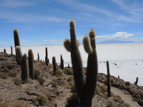 Salz, soweit das Auge reicht. Der weltgroesste Salzsee. Etwa so gross wie die Steiermark. Etwa 150km Durchmesser. Wir durchqueren den Salzsee auf zwei Etappen: Bis Mittag zu einer Insel. Diese ist voll riesiger Kakteen – 6m und mehr hoch.
