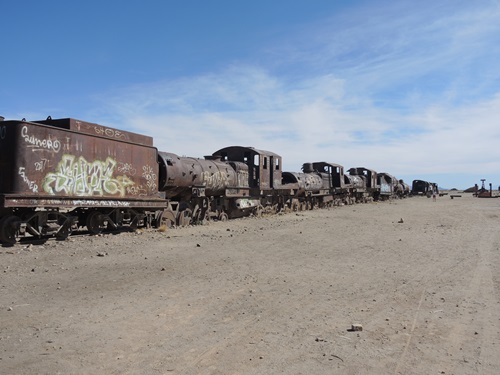 Uyuni am Salzsee hatte offenbar Bedeutung als Bahnumschlagstelle. Die Bahnlinie kommt von der Kueste Chiles. Heute zeugt der Bahnfriedhof davon. Dampfloks aus dem 19. Jahrhundert rosten dahin. Ein Leckerbissen fuer Technikfreaks. so etwas steht bei uns nicht einmal im Museum. Die letzten abgestellten Waggons waren allerdings bis in die 1980er Jahre im Einsatz.