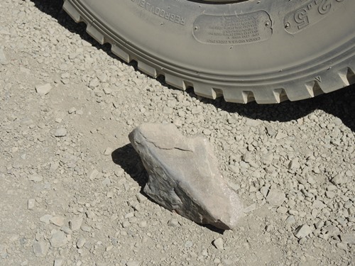 Weiter: Kurzer Stop für ein Foto. Ein Blick auf das Heck des LKW. Da steckt doch ein Stein zwischen den Zwillingsreifen. Der muss raus. Aber er wehrt sich. Also LKW-Rad lockern (gut, dass ich mehr als 70kg wiege, um stehend auf dem Radmutternschlüssel die Muttern lockern zu können). Der Stein gibt endlich auf.