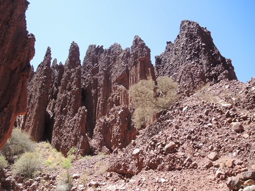 Rasttag. Wir sind nur mehr auf rund 3.000m Seehöhe. Es ist sehr warm. Die Umgebung ist grandios. Teilweise Wüste mit Türmen aus Konglomerat-Gestein. Unglaubliche Felsformationen. Dazwischen Flussoasen mit tiefgrünen Bäumen.