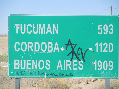 Wir sind in Argentinien angelangt. Gemäß Straßenschild an der Grenze sind es noch 5.200km nach Ushuaia. Wahrscheinlich ein paar Kilometer mehr, da wir ja nicht unbedingt die kürzeste Route nehmen.